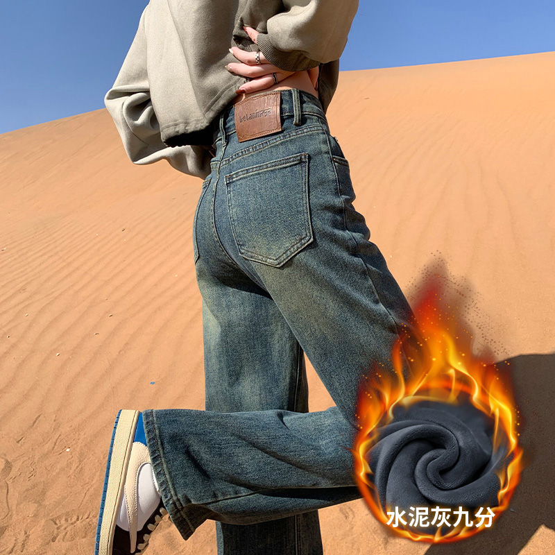 拉夏贝尔加绒直筒牛仔裤女秋冬季2025年新款小个子高腰阔腿裤子女