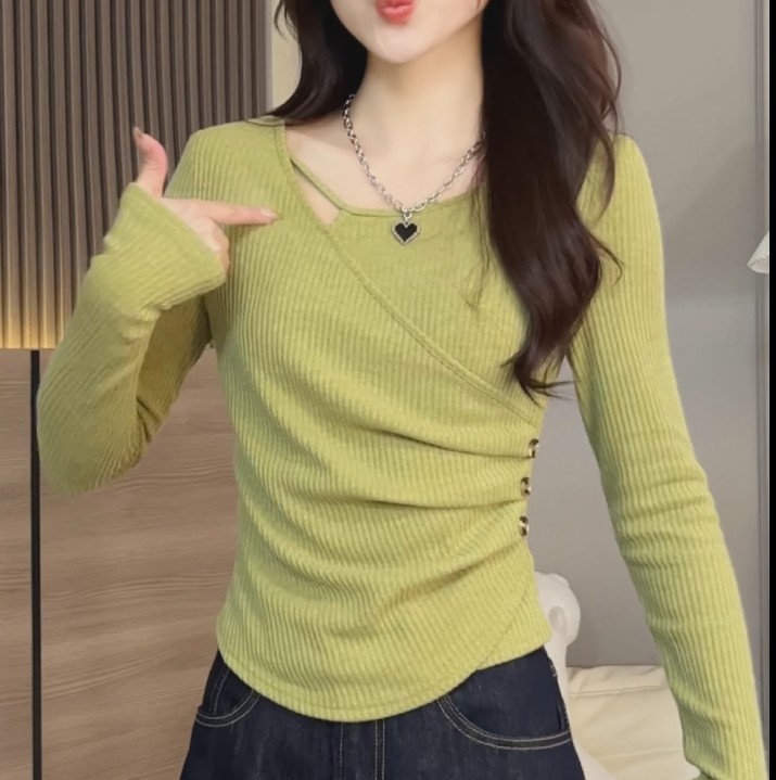 2024秋季新款时尚装饰扣子纯色收腰修身显瘦洋气长袖打底衫上衣