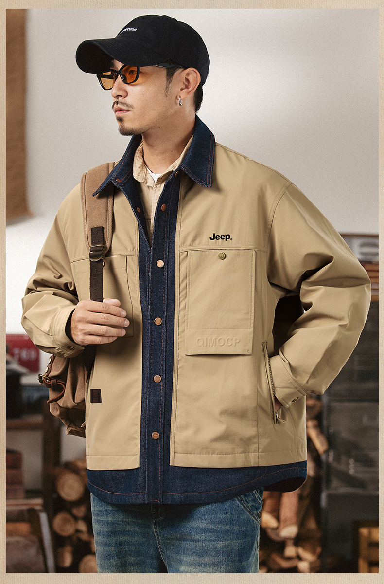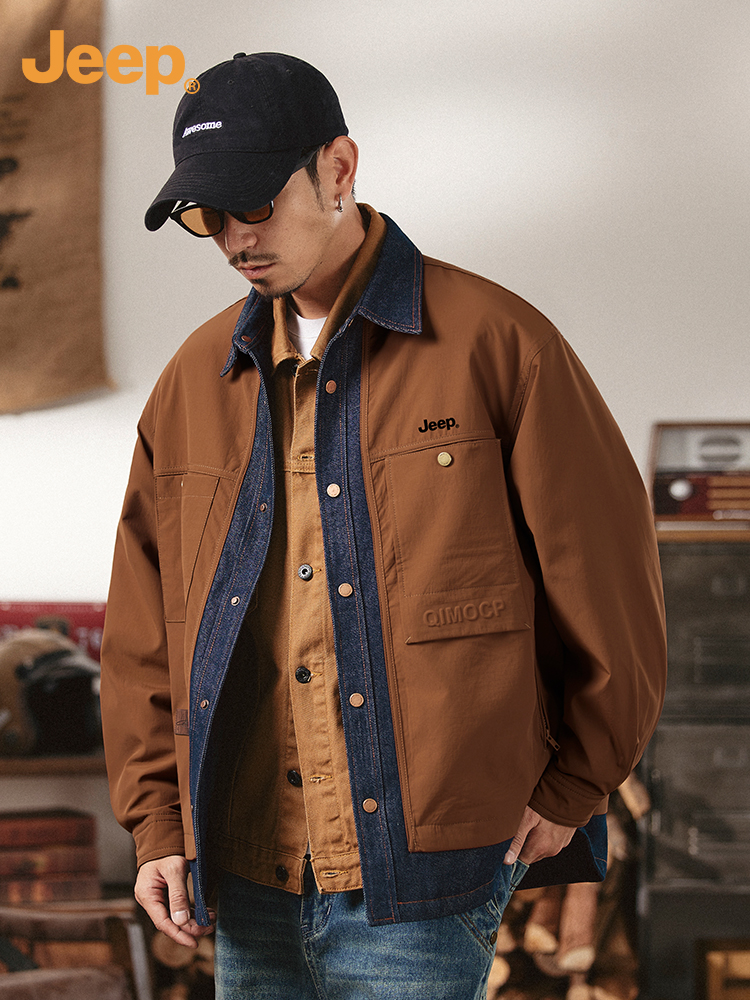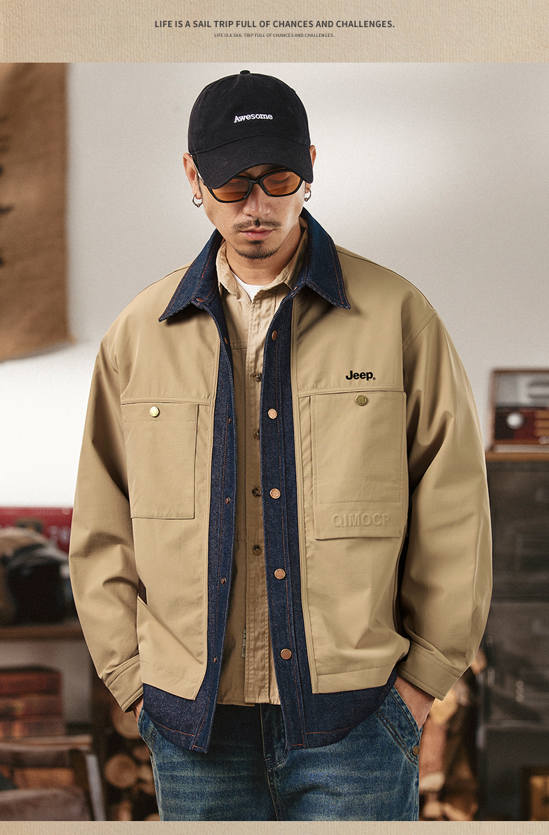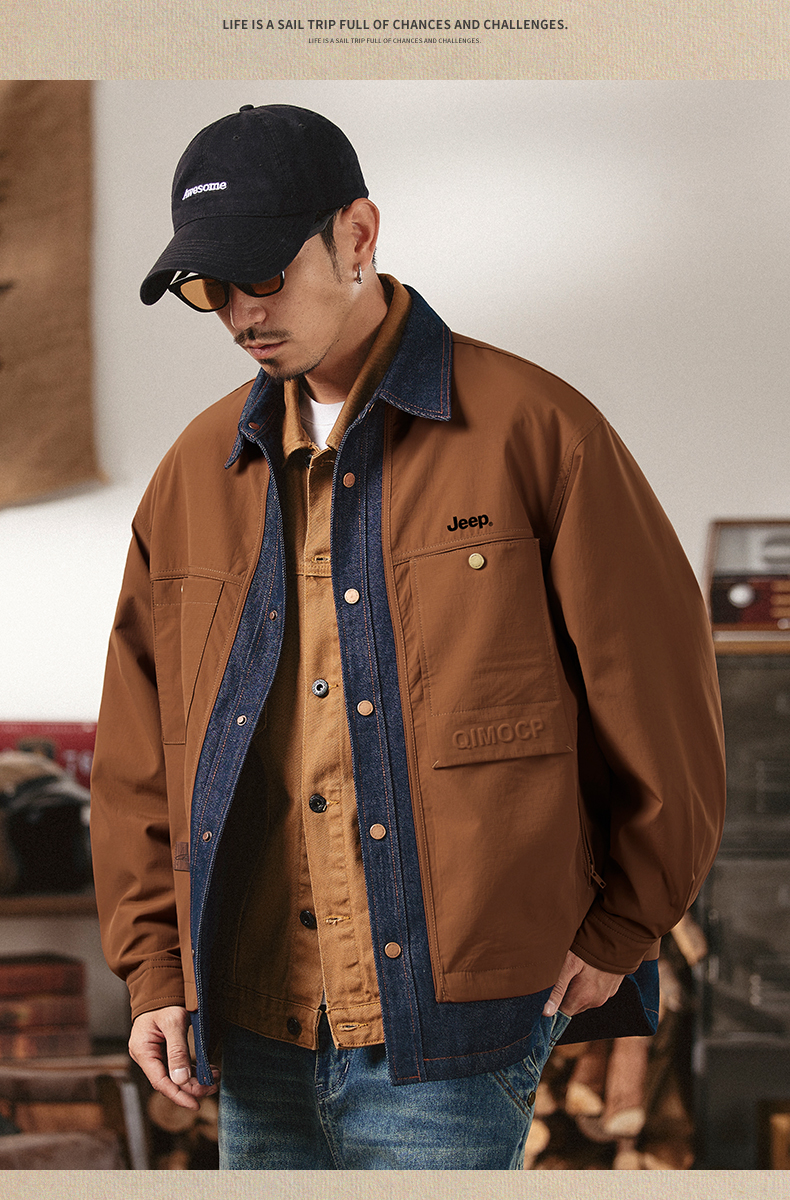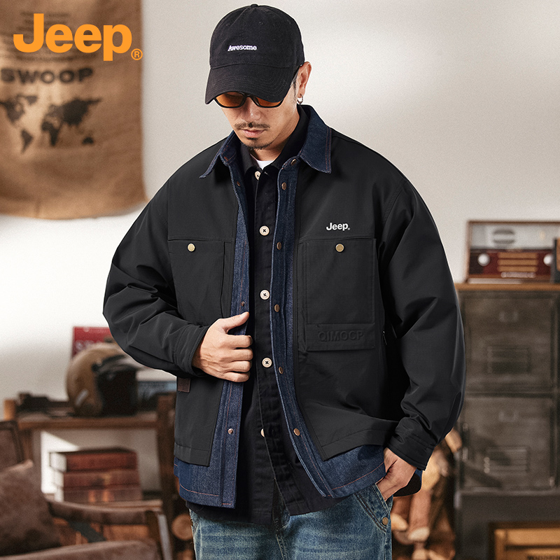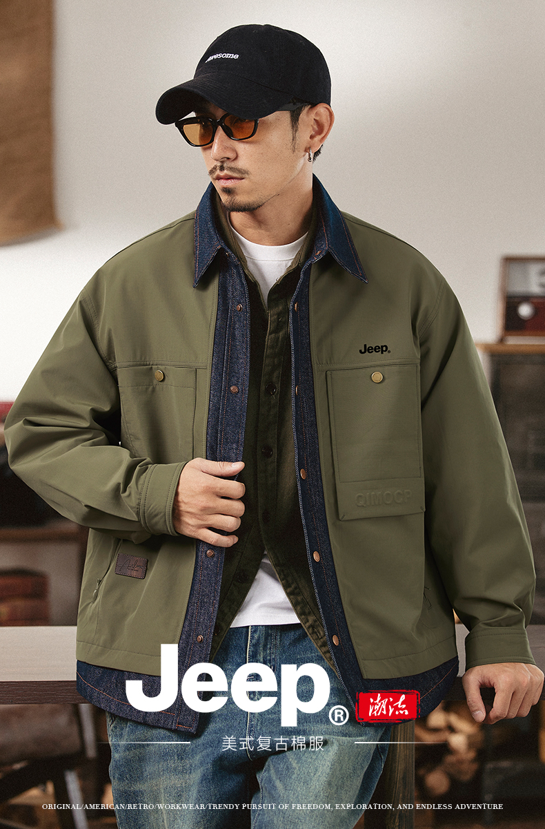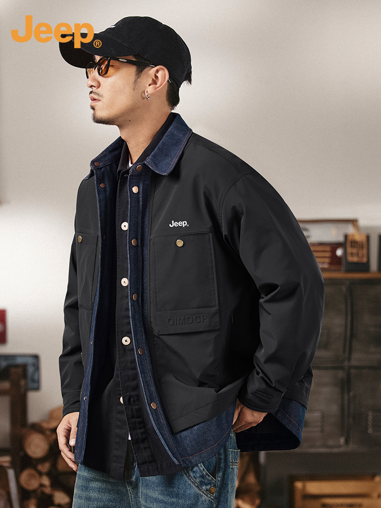 JEEP吉普工装夹克男士短款外套复古秋冬季2025新款假两件牛仔拼接