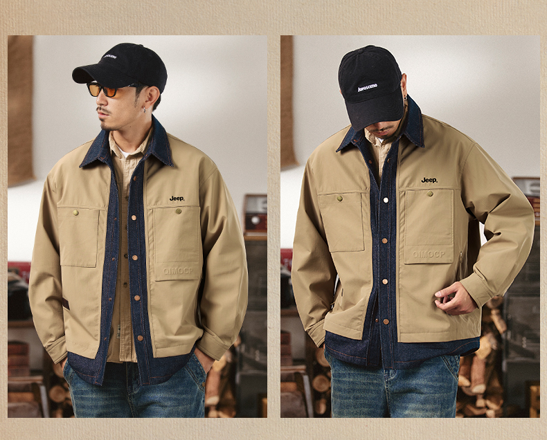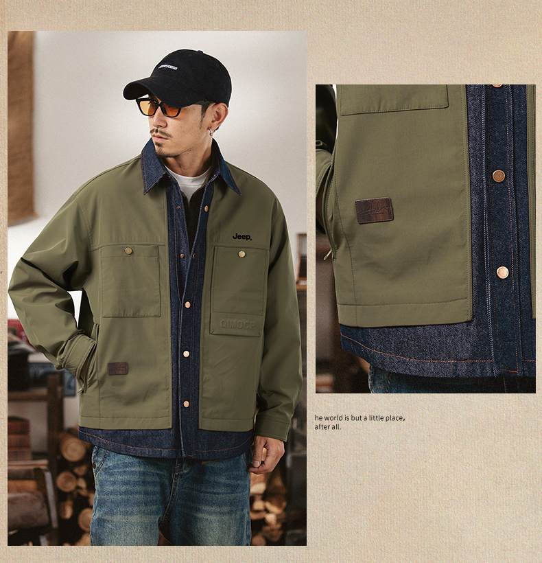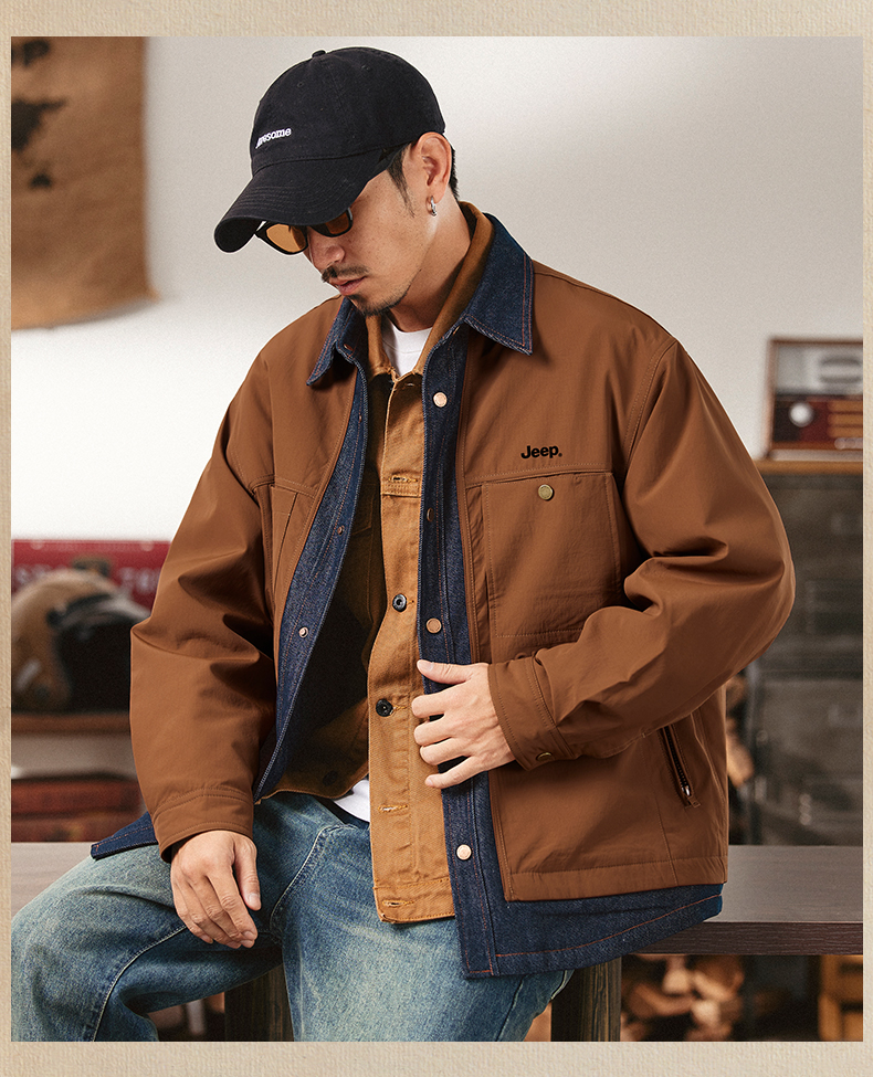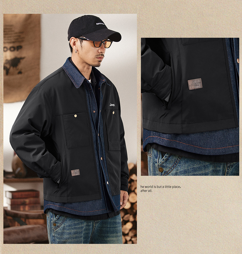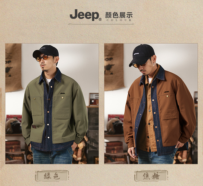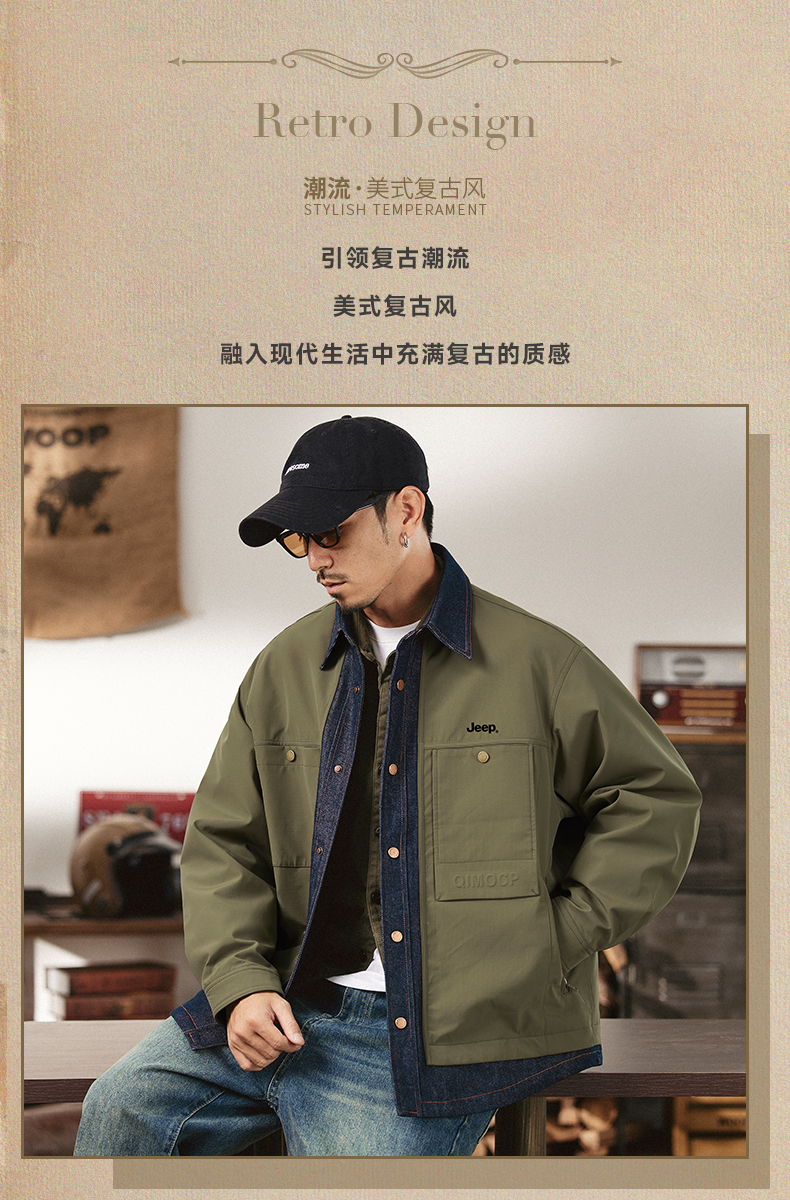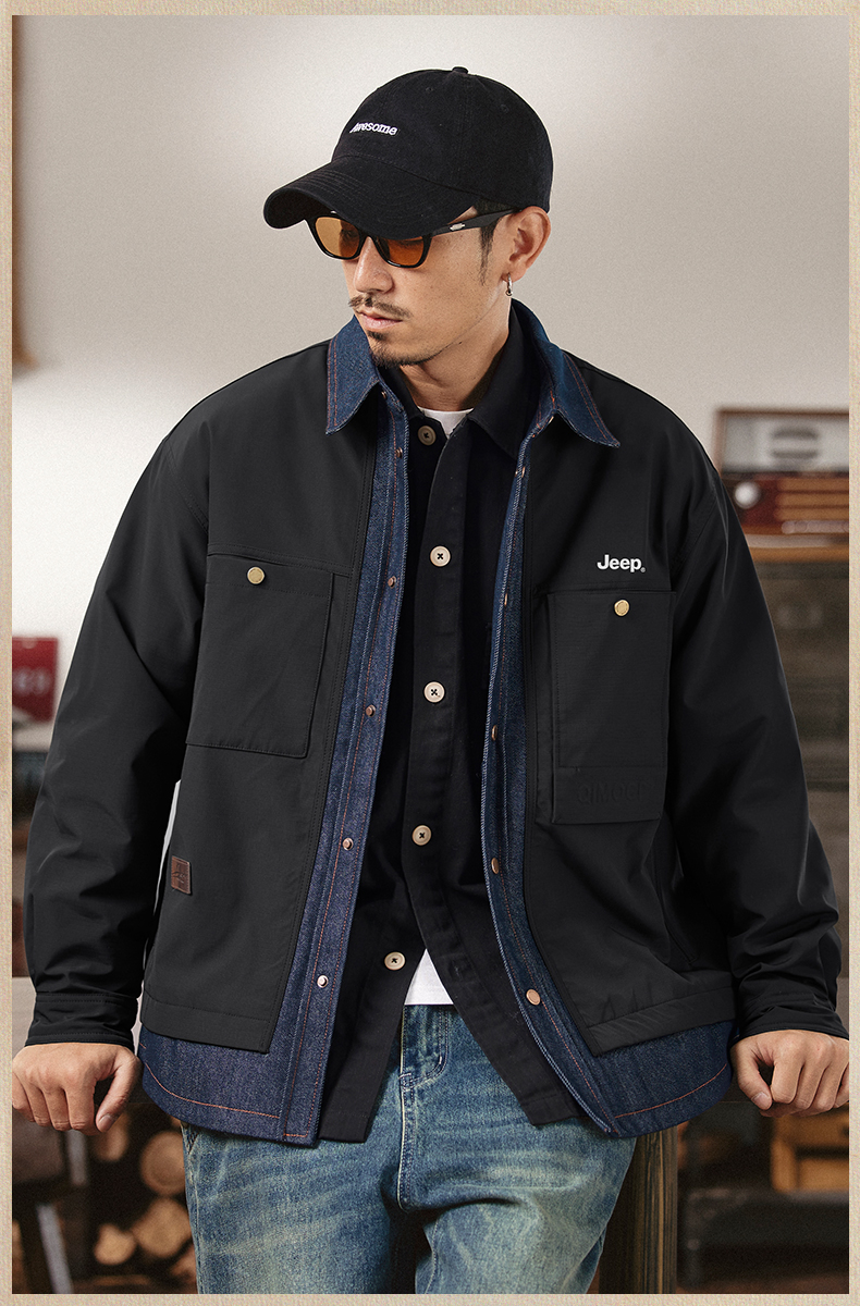 JEEP吉普工装夹克男士短款外套复古秋冬季2025新款假两件牛仔拼接