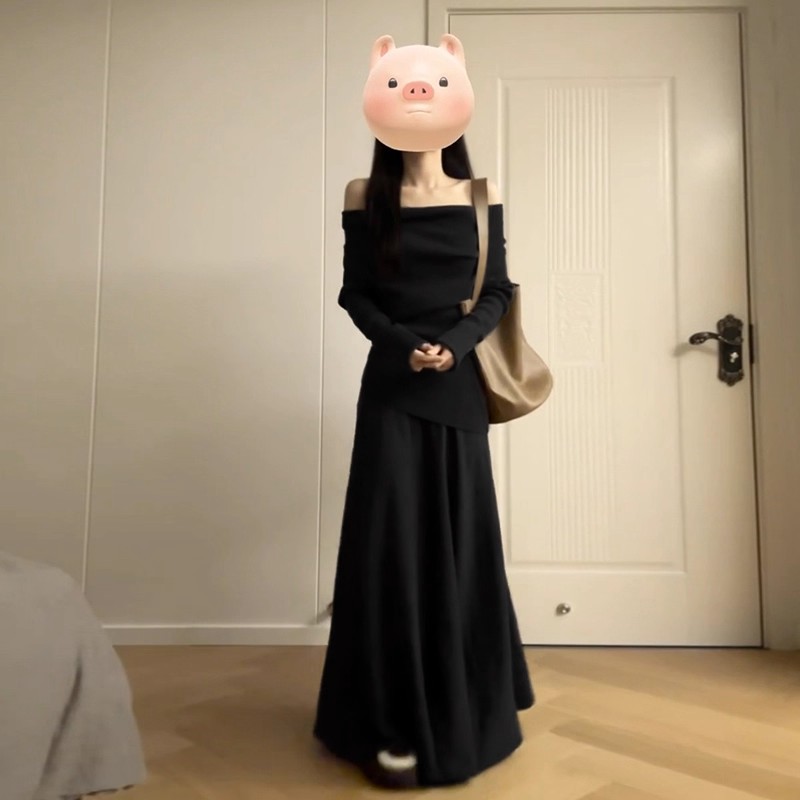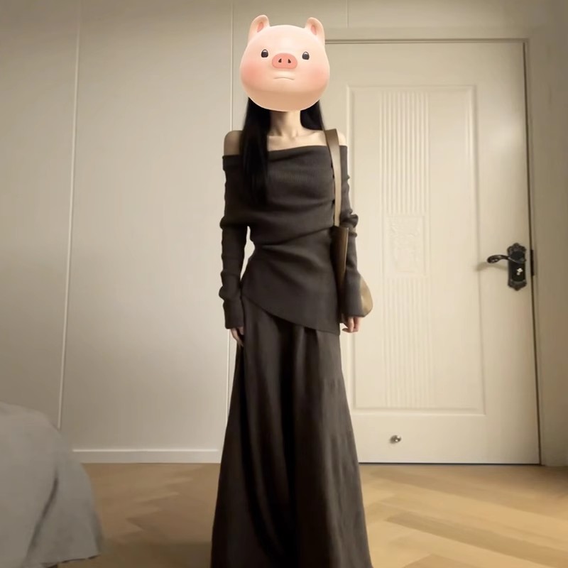2025新款气质一字肩连衣裙子女秋冬季韩系慵懒风穿搭一整套装长裙