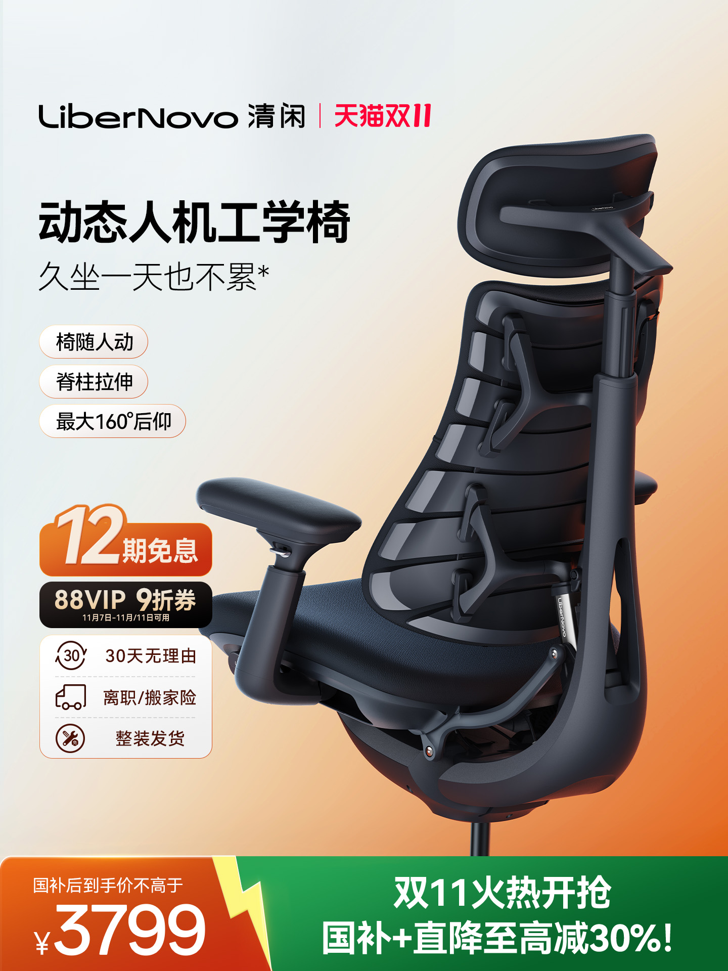 【双11抢购】清闲LiberNovo动态人机工学椅人体工学椅电脑椅办公